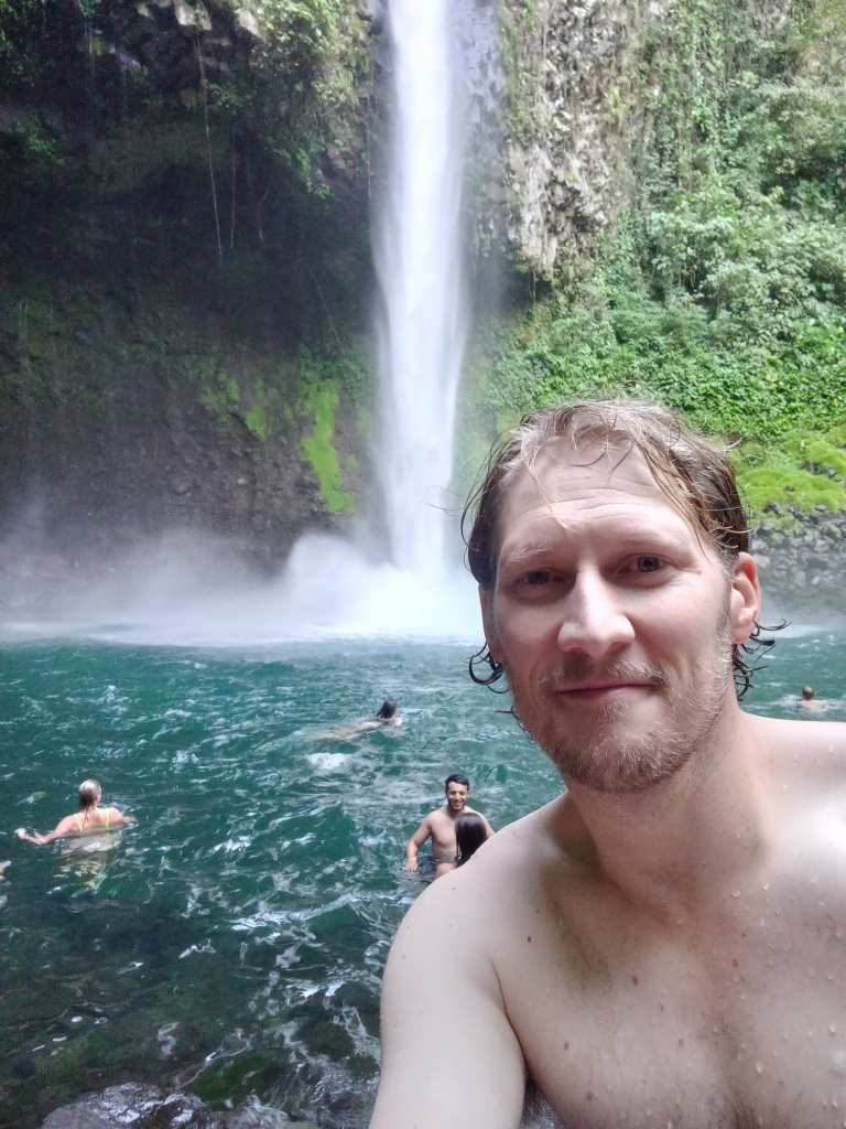 After that beautiful trip through the jungle and around the lava rock fields (huge 1968 eruption), then we grabbed some lunch and went to another big tourist attraction, La Fortuna waterfall, which falls (quite powerfully) about 200 feet to a deep pool below that you can swim in. You hike down quite a ways from the parking area to the falls, and it’s just gorgeous–shear canyon walls on probably about 150 to 180 degrees of the surroundings, then the river going off down the canyon. Being jungle, the shear cliffs are still green with vegetation. So beautiful.
