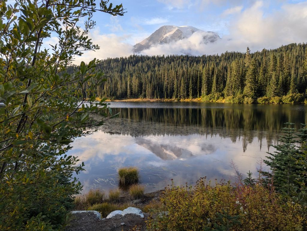 By the time we got there, Rainier was mostly clouded over again, but she was a bit of a tease because here and there you could see little bits of her, so we ended up staying there in the Long parking strip beside the lake taking picture after picture after picture after picture, trying to get at least a handful of decent ones.