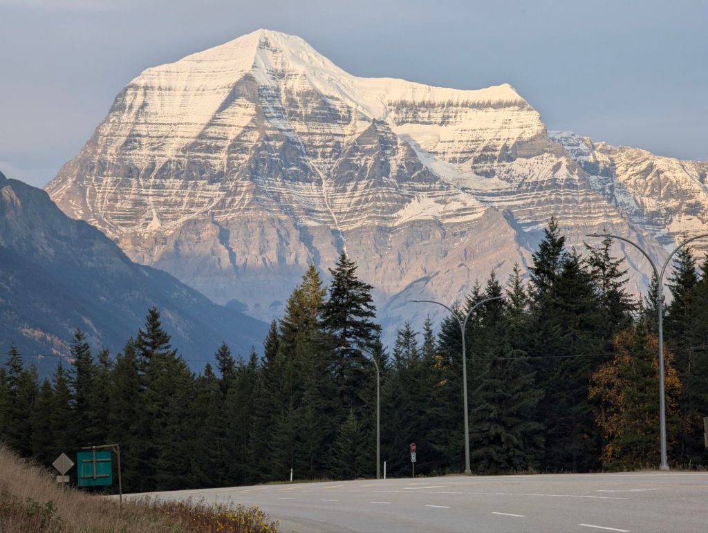 As we were winding around the road through the canyon between the mountain ranges, there were gorgeous vistas everywhere, but as we came around the bend heading east, Mount Robson seemingly jumped out from nowhere, an absolutely massive mountain that seemed like one huge Rock from top to bottom.