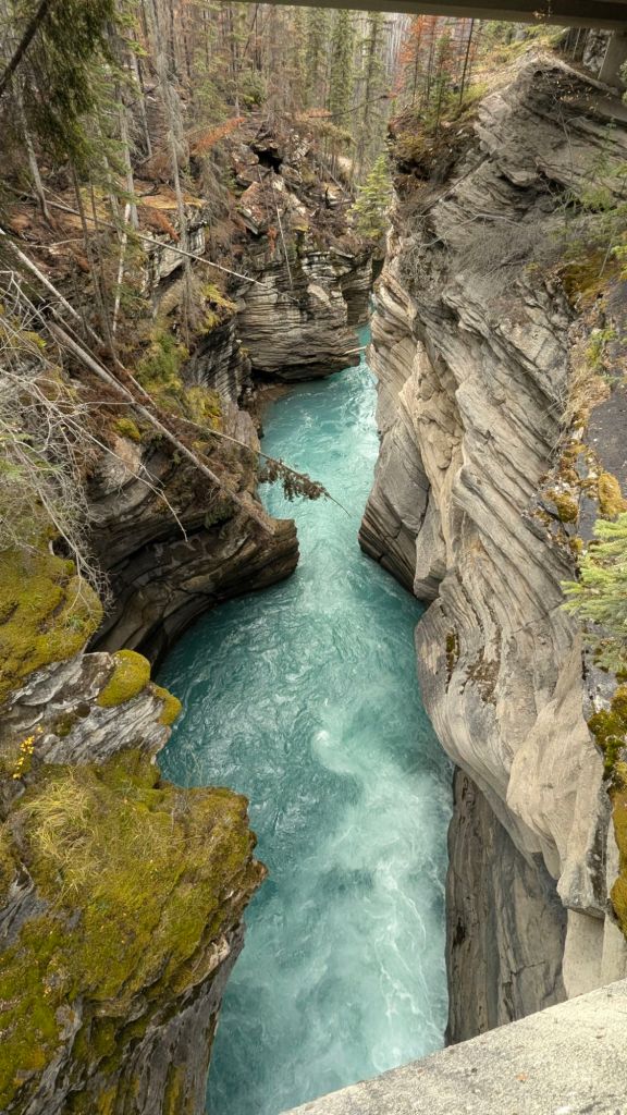 We stopped off to look at the beautiful Athabasca Falls, with the turquoise Waters flowing down the Cascades into a little slot Canyon before opening back up to the wider River.