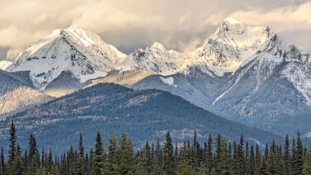 Gratefully, the drive from Radium Hot Springs to Banff National Park did indeed yield some beautiful scenery. There were some visible peaks. We also got our first snowflakes up the trip.
