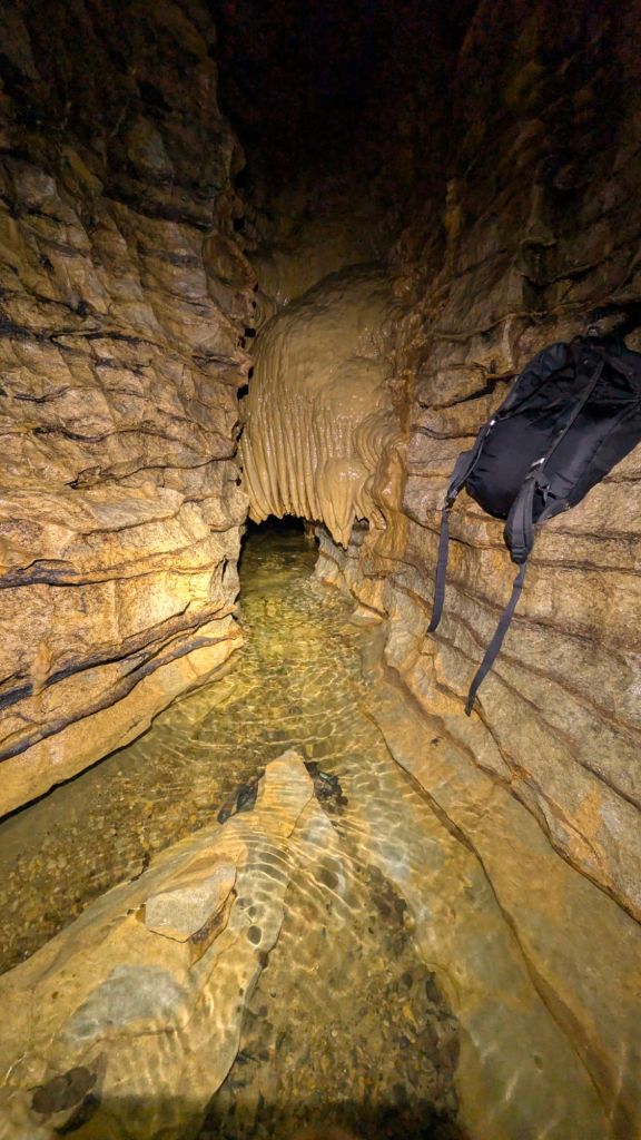I chose the latter, hanging with my pack up on a nearby formation and proceeding forward with just my headlamp (and a broken headlamp in my pocket that I’d found in the stream running through the cave).