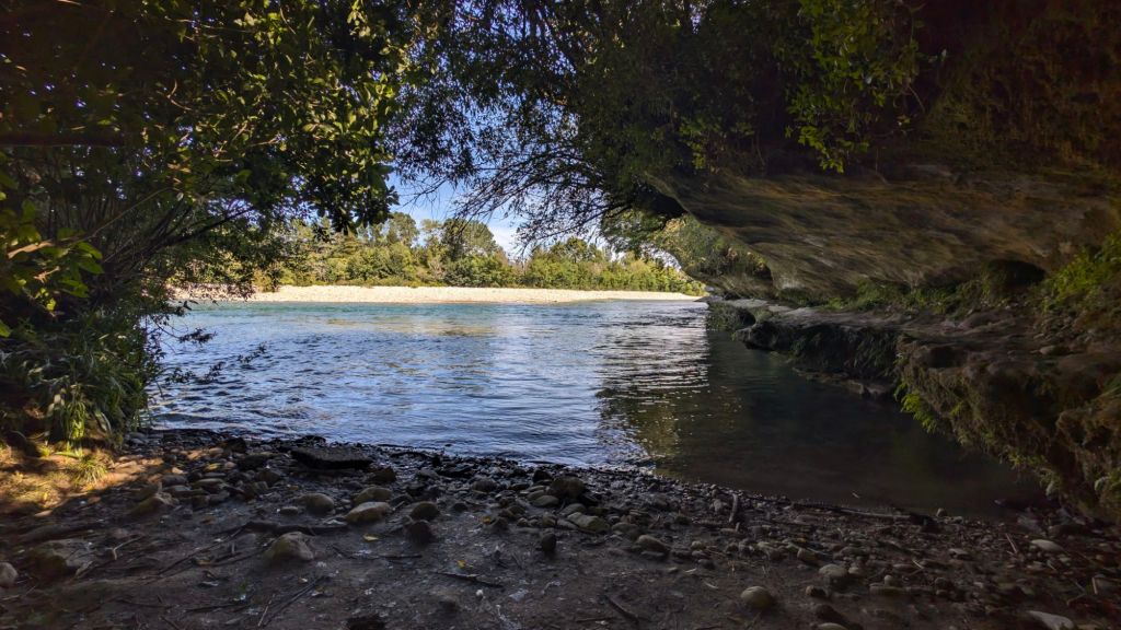 I then made my way down the large braid bar to a section of the river where there was a long cliff on one side with a large overhang on part of the cliff, an overhang big enough that you could climb up from the river onto the rock ledge and be under the overhang and out of the weather if you wanted (were it stormy).