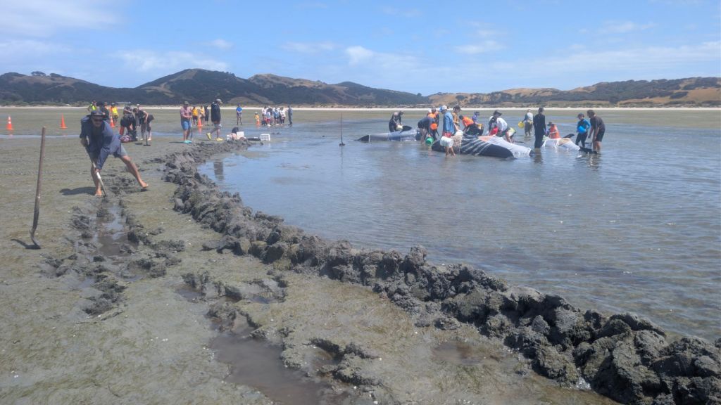 The biggest of all of the whales from the pod of 15, the one that had been leading the pod up that river channel, had died overnight, leaving four left in the Pūponga area that survived the night but hadn’t been able to escape on their own with the overnight high tide.