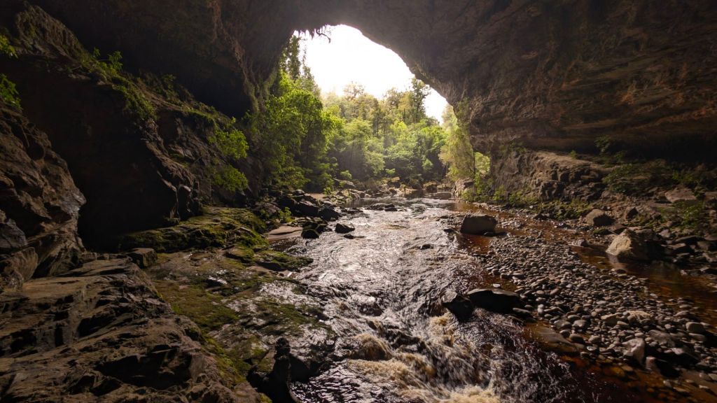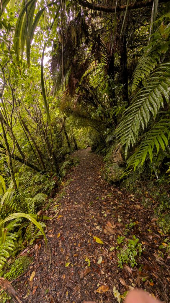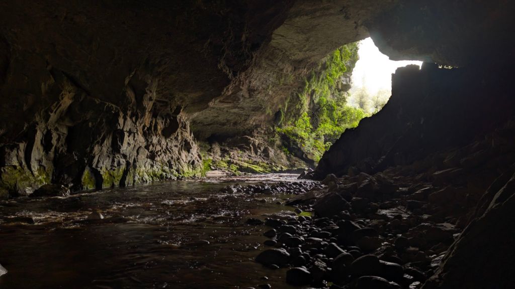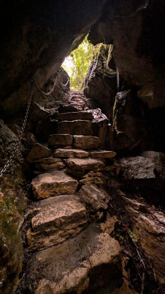 After parking in a gravel car park, I followed the roughly two-kilometer? trail, winding up, down, and around through the thick bush until reaching and descending the stone steps of the cave entrance.