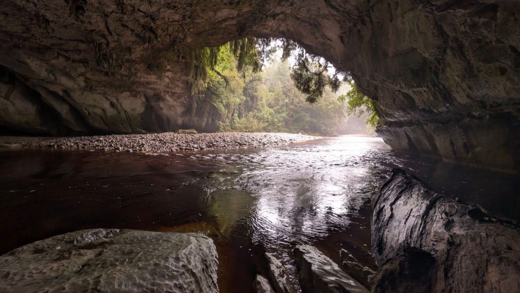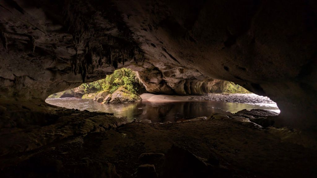There was an older couple in the cave, technologically quite well set up, by the looks of it, taking photographs, the woman right at the entrance to the cave, and the man further down by the river’s edge where the Oparara River (a dark, tannin-stained, red-brown river) flows under the arch portion of the geologic formation.