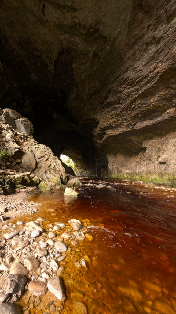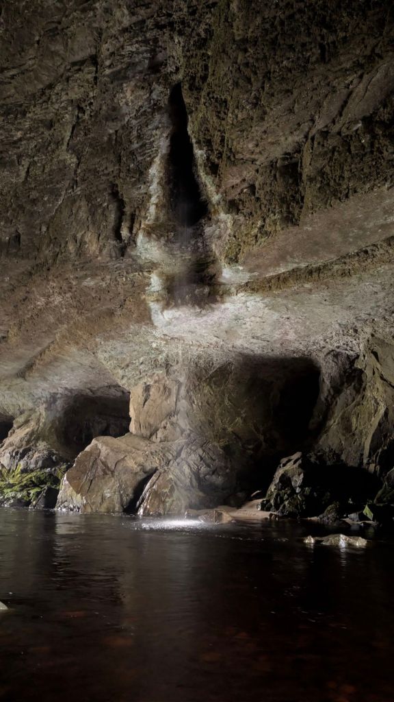 I wasn’t feeling adventurous enough to want to cross the river and get a closer look, but I was certainly curious about the source, if one could see Open sky and the little waterfall running through a hole in the roof, or whether it was just cracks in the rock that converged to a point where the water then flowed through the roof and down to the tunnel floor and river below.