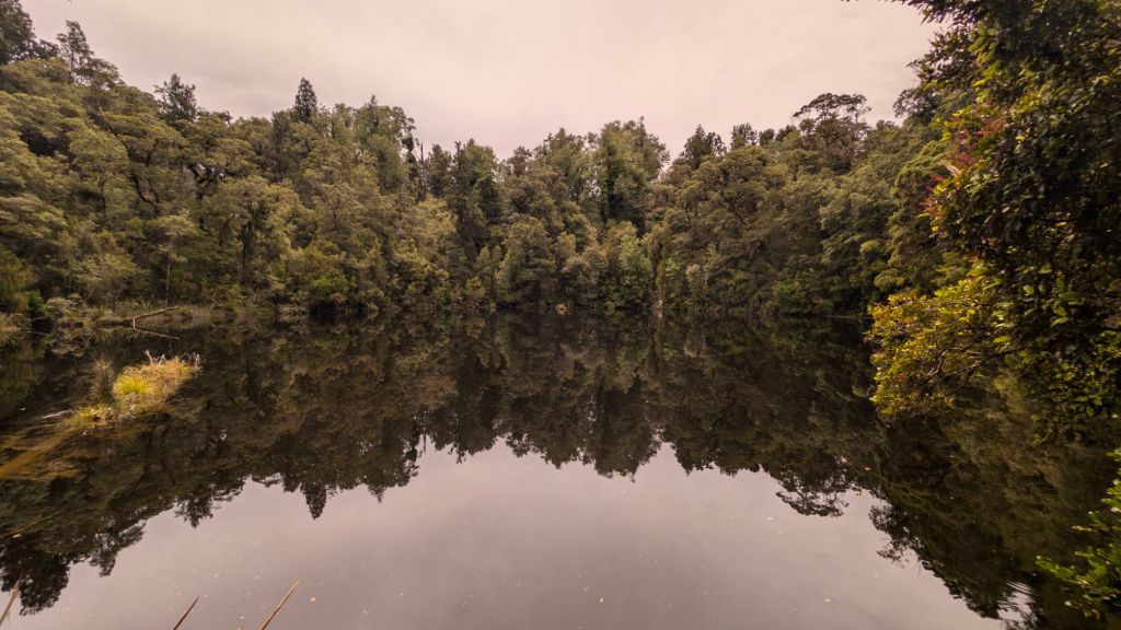 My last stop in the Oparara Valley was backtracking a little bit, along another two-kilometer? walk through the beautiful lush bush, this time to a small lake/large pond known as Mirror Tarn.