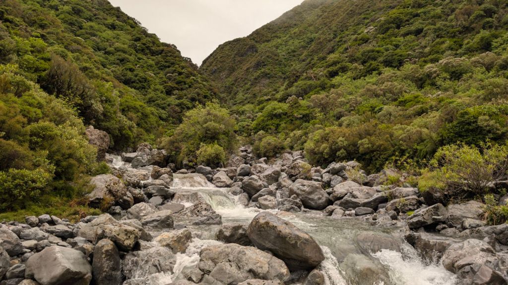 You rock hop and scramble your way up this frothy river through a narrow winding canyon with steep mountain hills on each side of you, and then you come to the end, as if walking through a v-shaped hallway in your home with no roof and coming to the end. The waterfall should be pouring down right in front of you because you’re in this narrow canyon.