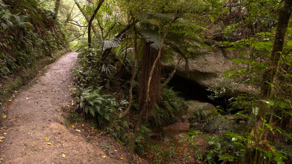 And just as expected, when I got to that sign, it had little discolored arrows, one for the waterfall pointing the way that I had just come back from, and one for the glow worms pointing up the nice gentle hill in front of me. π