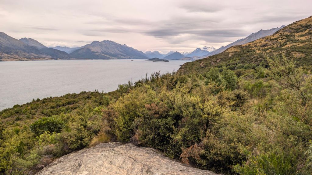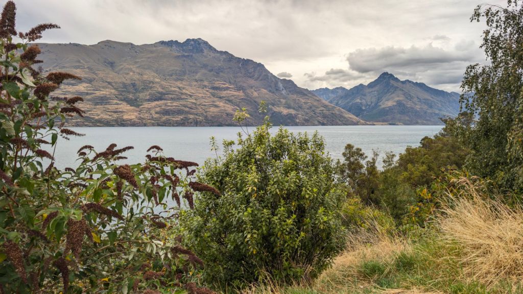 As we chatted, I drove over to a park at the lake shore just a few blocks from the branch building, hoping to be able to park and stare out at the lake while chatting. Unfortunately, it was pretty crowded, so I decided to drive through Queenstown and find a less-crowded spot somewhere along the eastern side of the north end of the lake, gratefully finding a perfect little perch on a large turnout looking out at the surrounding mountains and down on the water below.