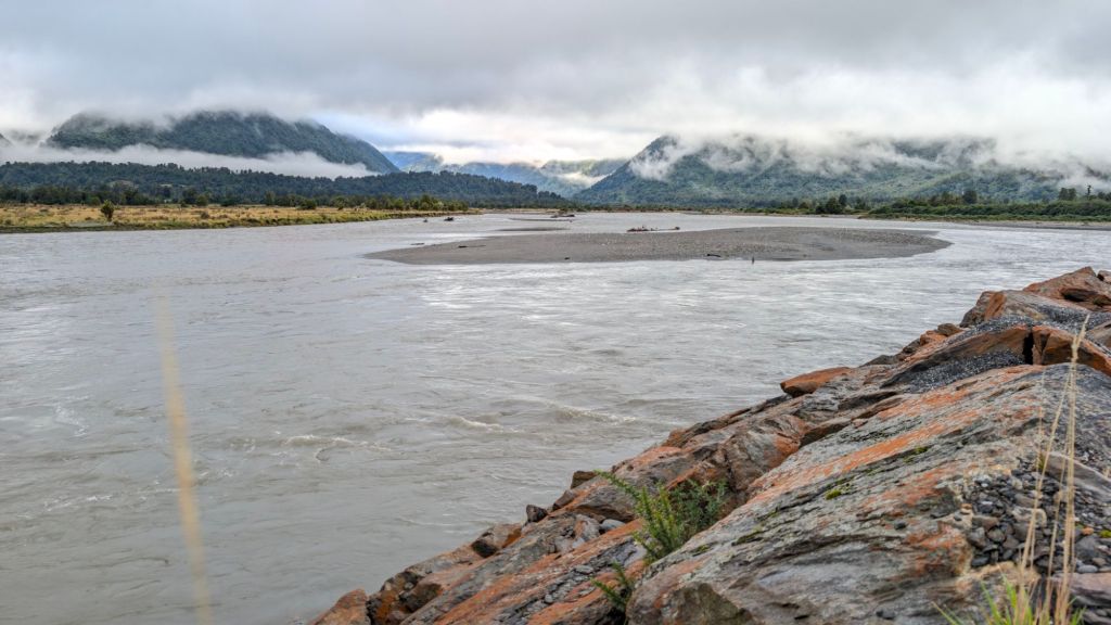 Instead, I drove across the Waiho River Bridge, parked in a little dirt parking lot on the other side, and then walked back to take pictures from the bridge. 🙃