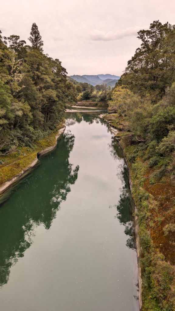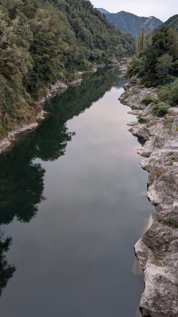 From above, it didn’t look as high as Hokitika Gorge. It was getting on toward dusk at this point, so the sun wasn’t shining directly down on the river, but looking at the floating leaves and other debris on the surface, I didn’t really feel any nerves at the thought of jumping from the bridge.