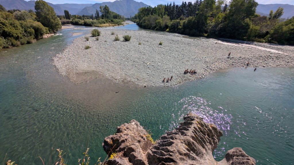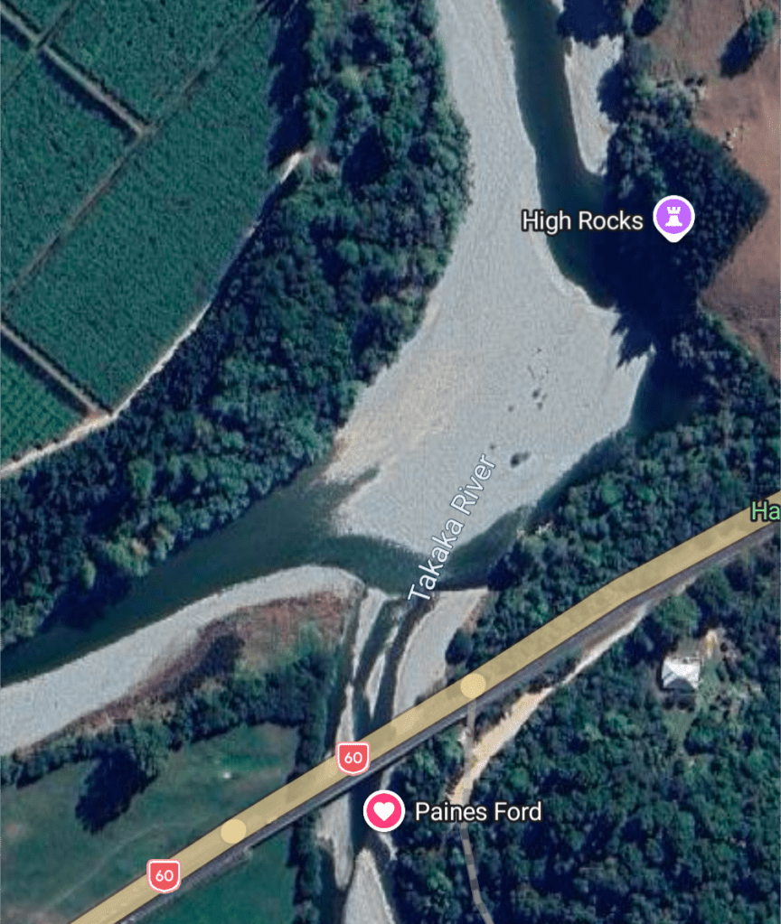 I don’t know how far across the river channel is from bank to bank. My beloved Paines Ford adventure spot is just barely down river from the confluence of Waingaro and Tākaka rivers, and it’s wider at the confluence and narrows a little bit where the jumping and climbing cliffs are.
