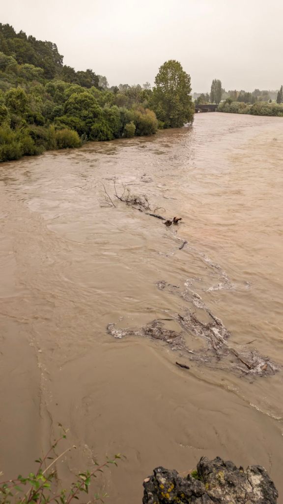 The river was absolutely raging. What had been a gentle flow with lots of exposed wash everywhere (far more wash than water) with the normal, gentle micro rapids as the river descended, was now a bank-to-bank, raging monster.