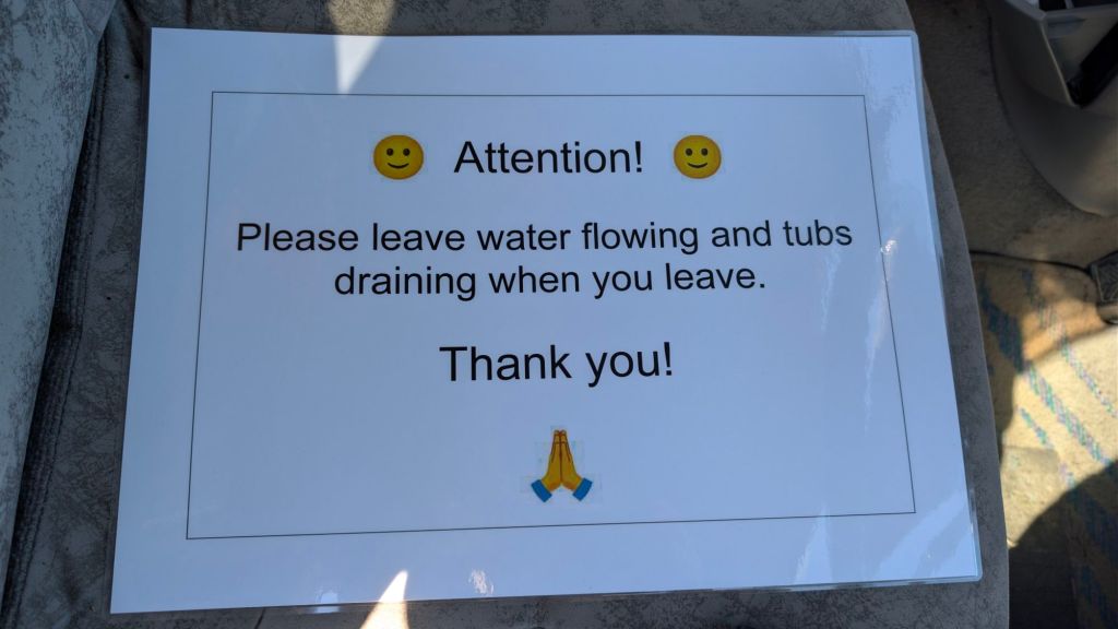 Since I didn’t have the sign with me, I walked back up the path to my van (the hot springs are on a steep hillside), grabbed my little sign, my double-sided sticky tape stuff, and four pins I had left over from what I used to mount the lights on my headliner, and then I headed back down to the hot spring tub area.