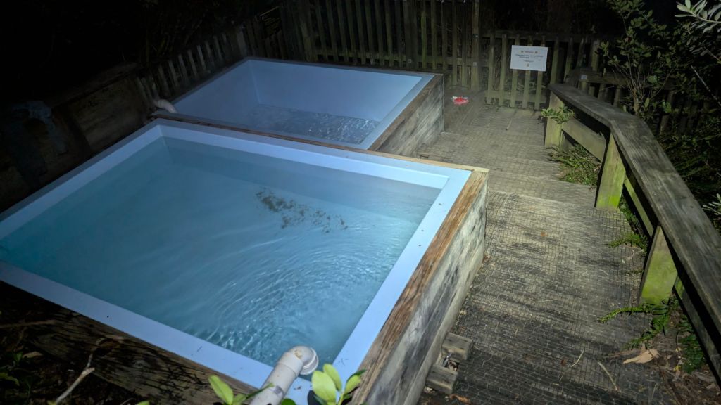 After enjoying the hot spring tub for a good long time, getting in and out and in and out, and also losing a fair bit of dead skin that came off in rolls when I rubbed my skin with my hands (one more good reason to drain the tubs after every use π), I drained the tubs, and then took some pictures of the scene in the dark.