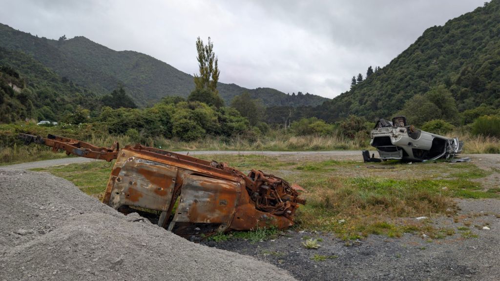 In one turnout that featured the kinds of gravel piles that are set up for road maintenance, there were a couple of vehicles dumped upside down. One that had clearly been there for a long time, and one that looks like it had just recently been dumped there.