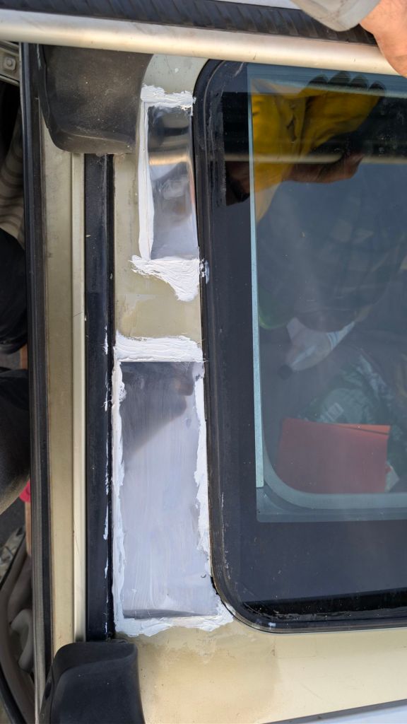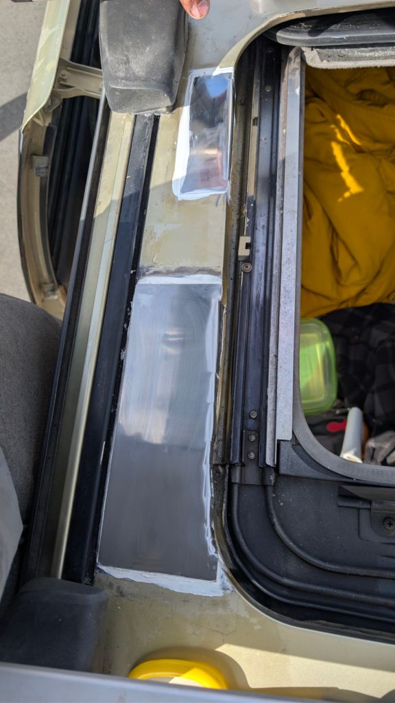 So now I have a watertight vehicle without tape! Well… at least for the leak that I have been dealing with since the tape had peeled off sufficiently to let water inside. I’m guessing that any water that gets through the gap between my repair and the sunroof will also just drain away without issue, but I’m going to leave the tape on until that repair is completely done.
