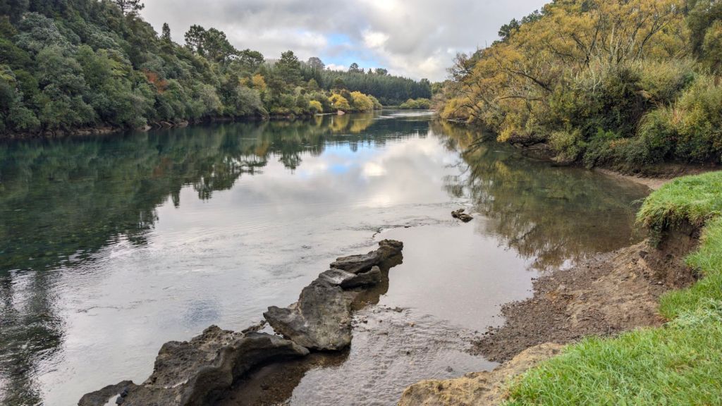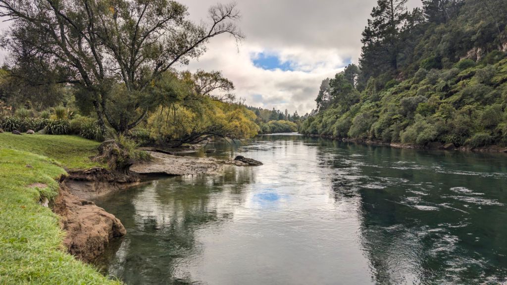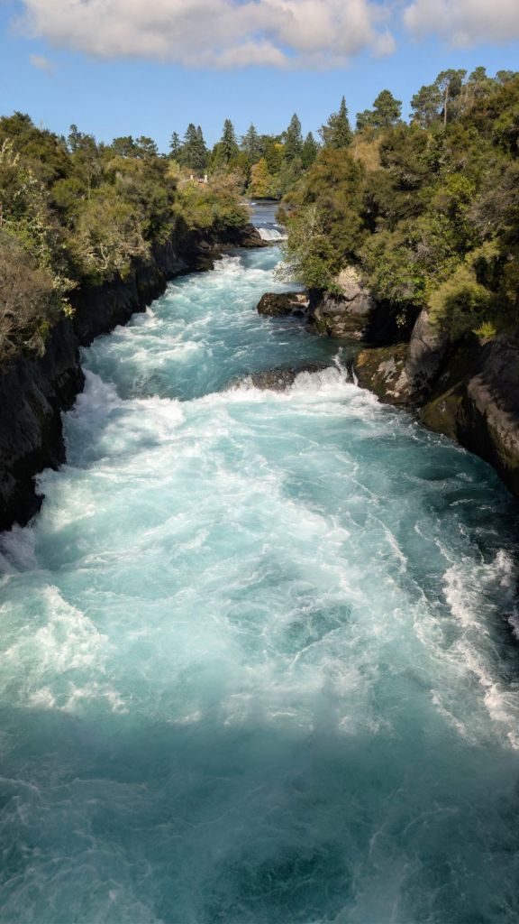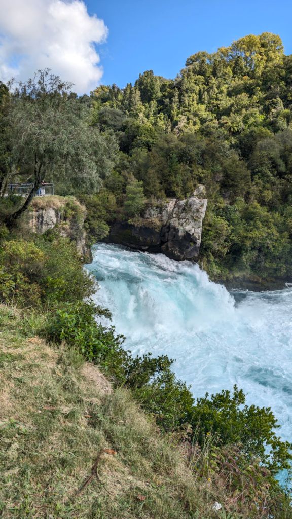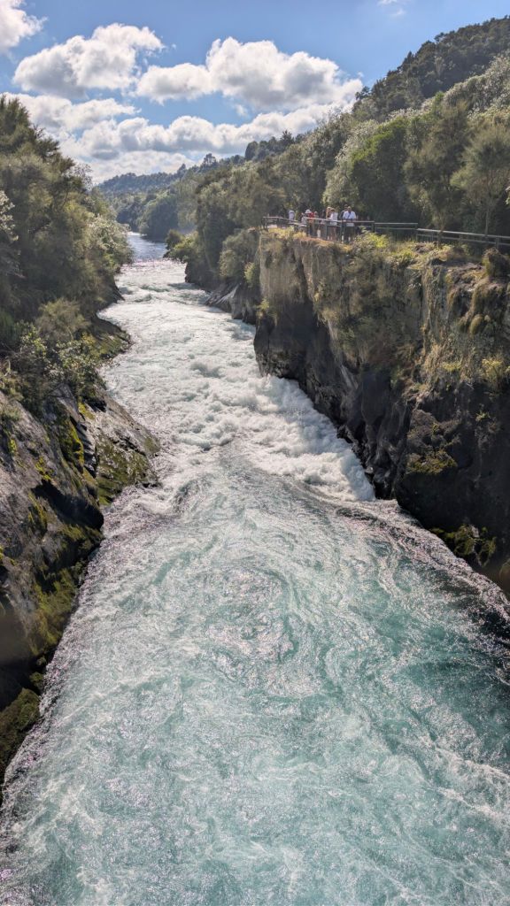 I spent a little while chatting with another couple that had parked next to me, and then eventually I bid farewell to them and the British couple, heading down river toward Huka Falls.