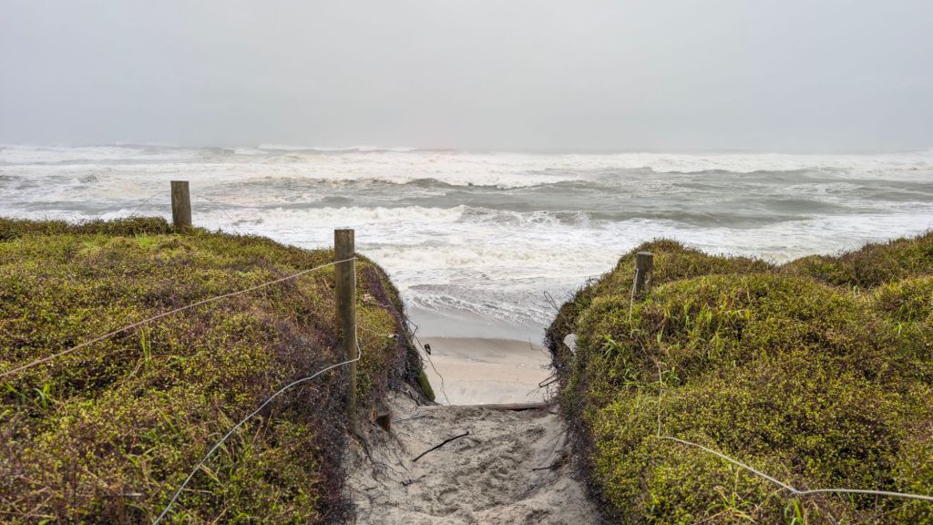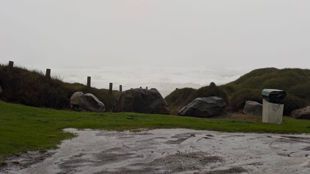 As I watched the storm tracker (which was a lot harder to find than I would have expected), I noticed that the cyclone’s path was shifting, and, hoping to catch the eye, if there even was going to be one, I drove back through Tauranga, then past Te Puke, and even up at Otamarakau Beach Reserve (a small sort of afterthought-of-a-park looking place [which I appreciate], with a very small gravel parking lot and a porta potty-sized lung drop.